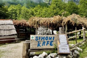 Take breaks as needed and pace yourself. Use trekking poles if you have them. After 2.5-3 hours total from Theth, you’ll reach Simoni Kafe at 1,450m—the most welcome sight on the trail. This mountain cafe offers cold beer, water, coffee, raki, and their famous sheep yogurt with honey. There’s a small waterfall nearby with fresh water, bathroom facilities, and shaded seating. This is halfway to the pass, so rest properly here for 15-30 minutes.