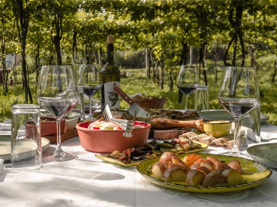 Lunch is served at Klea Restaurant (or similar) in Berat. In the afternoon, we transfer to Alpeta Winery in Roshnik. We walk through the vineyards, tour the winery and distillery, and taste three wines and two rakis paired with seasonal fruits, olives, and local cheeses. The winery staff explains the production process and what makes Albanian varieties distinctive.